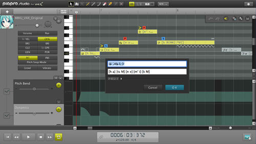 『初音ミク V4X』の歌声データベースは、音楽スタジオにて大量に収録された声優:藤田咲さんの声に各種編集を施し、様々な声色を含む形で、丁寧に制作されております。多彩な声色をコントロールするE.V.E.C.機能や、ジェンダーファクターやブライトネス、クロスシンセシス(モーフィング機能)やグロウル(うなり声/ガナリ声機能)などの各種機能に対応しており、同梱のボーカルエディター「Piapro Studio」から操作できます。